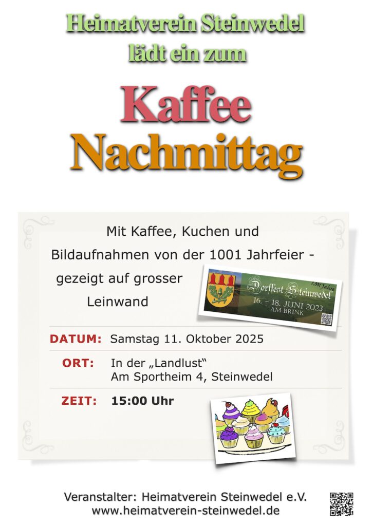 Nächster Termin : 11. Oktober 2025 um 15Uhr … Wir zeigen Bildaufnahmen von der 1001 Jahrfeier …. im der Landlust in Steinwedel